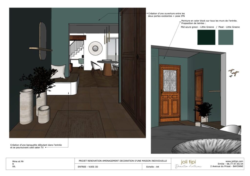 Une entrée désormais ouverte sur la pièce de vie grâce à l’agrandissement de l’ouverture. Je leur propose une banquette aux courbes douces, se prolongeant en meuble TV coté salon.