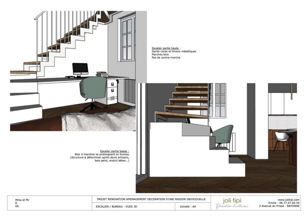 - Un bureau est intégré sous l’escalier, bénéficiant de la lumière de la petite fenêtre.