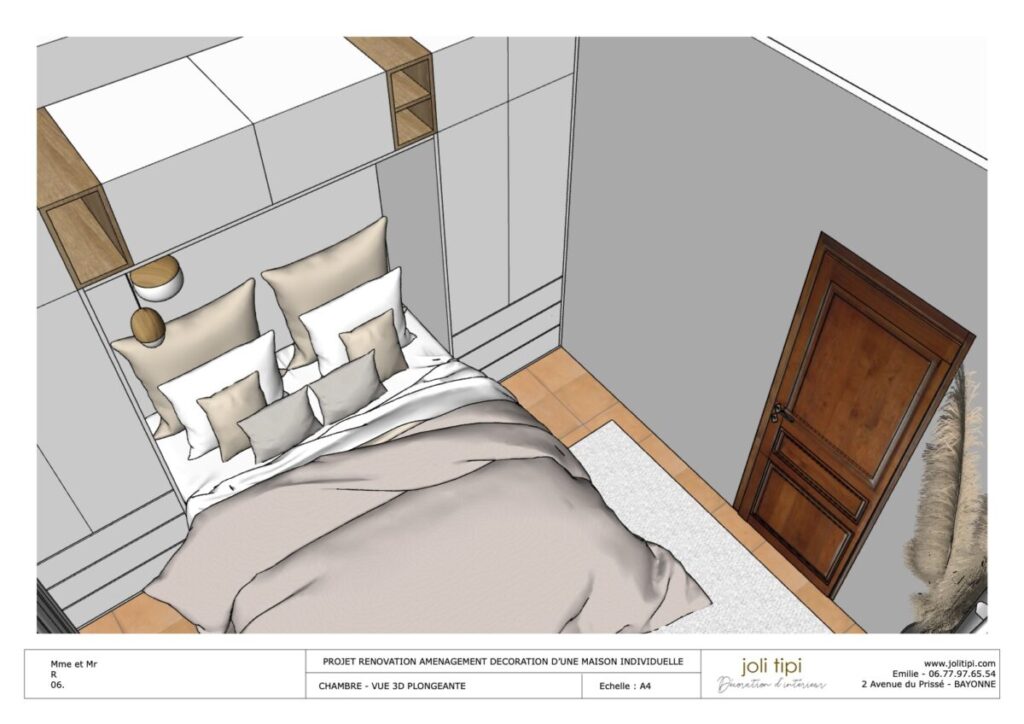 Cette pièce de seulement 10 m2 sera destinée à l’aîné des enfants de la famille. Elle bénéficie d’une belle lumière grâce à son exposition sud-est. Je dessine un dressing pont afin de conserver une parfaite circulation autour du lit et un accès facilité aux deux fenêtres avec ouverture à la française.