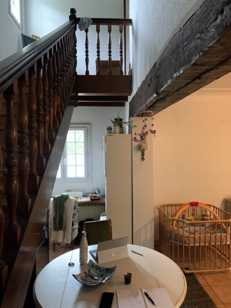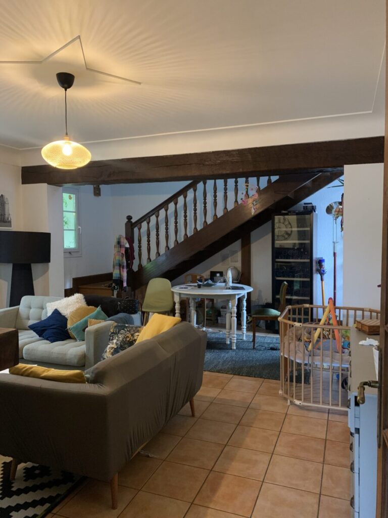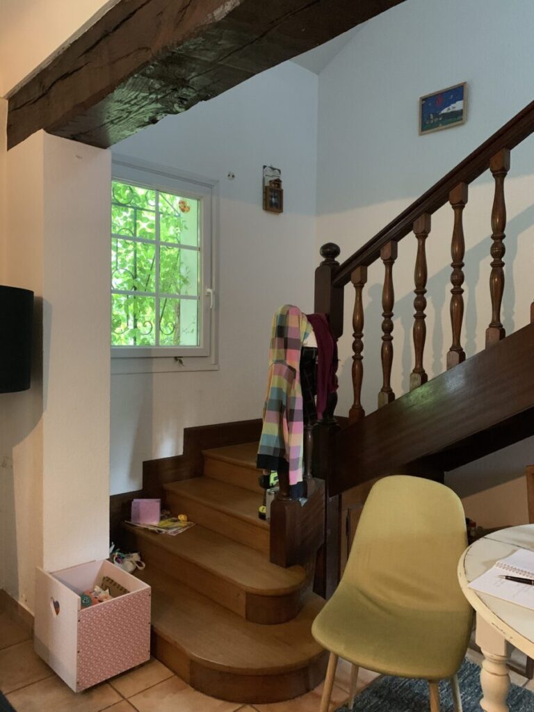 - L’escalier massif est remplacé par un modèle plus compact mais toujours confort, permettant la création d’une grande baie vitrée sur le pignon sud de la maison.