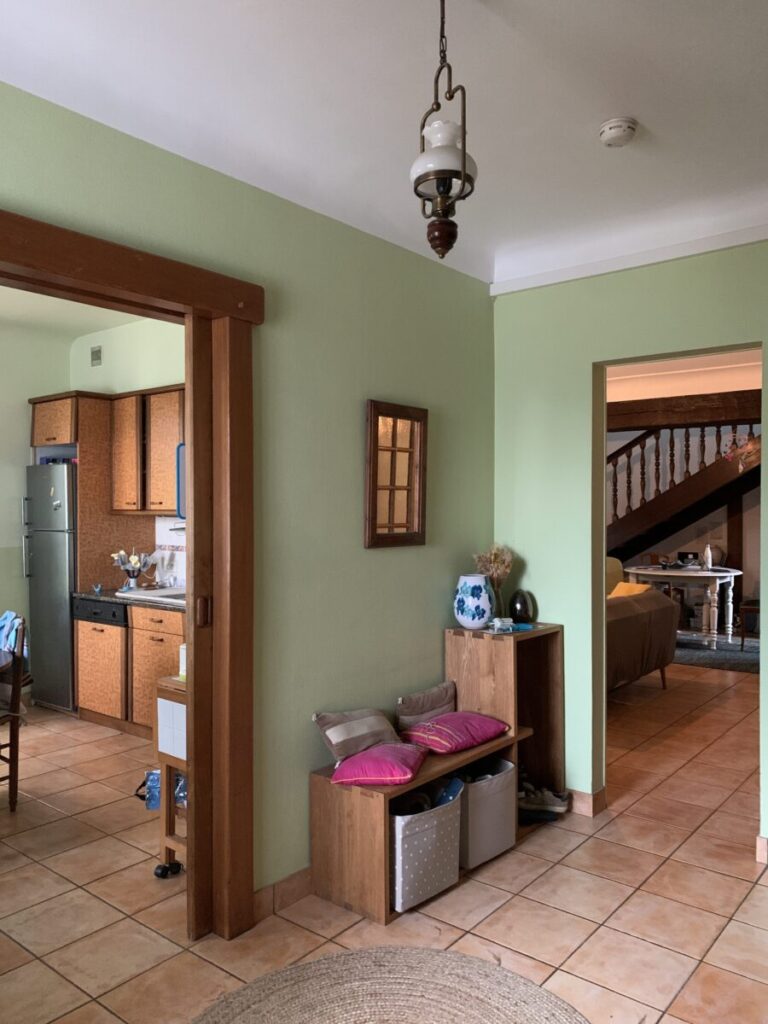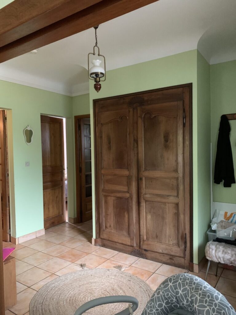 - L’entrée est conservée mais ouverte sur la nouvelle pièce de vie.